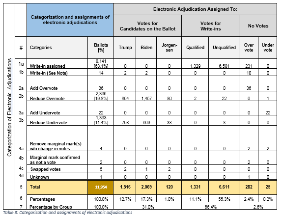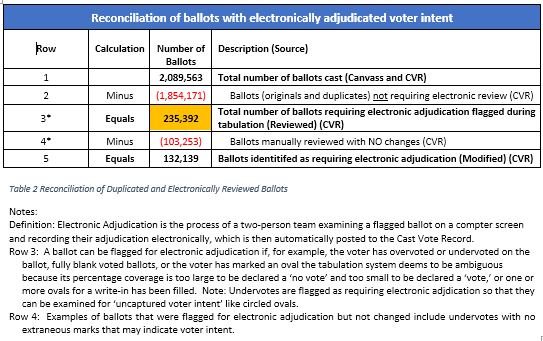 Here is a table that accounts for every ballot that underwent electronic adjudication: