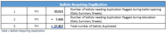 You can see there were a total of 27,457 ballots that were duplicated and included in the official results. These included mail and early ballots that were duplicated by the election boards before they went to the central count room where the ballots were tabulated. The remaining 7,436 ballots were those that were rejected by the tabulators for some reason and had to be duplicated.
