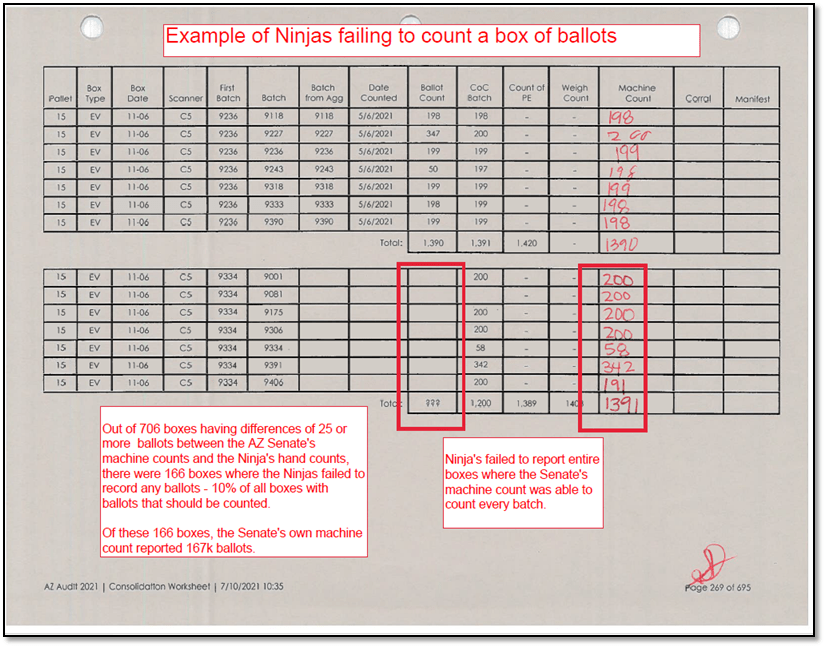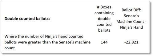 An enormous discrepancy of 15,692 missing hand counted ballots from 40 boxes out of out of 1,634, supports our opinion that the Ninja’s hand count of ballots was so far off the Senate’s machine count of ballots that any statements about the vote counts (e.g., that Trump lost 261 votes) are meaningless.