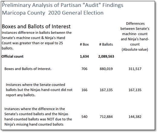 The Arizona Republic highlighted our finding that over 311,000 ballots were involved in the boxes of interest where the Ninja hand count and the Senate machine count differed significantly. This large number of ballots breaks down into 167,000 where the Ninjas did not report anything about their hand count and 144,000 where they did report something but there were still significant differences with the machine count.