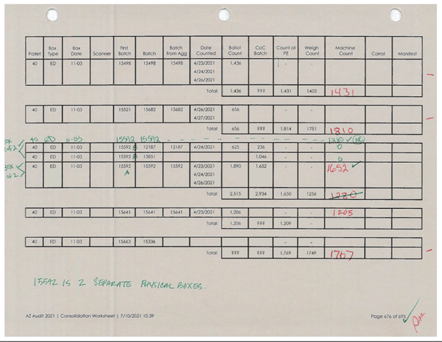 On July 12, the Audit Guys sent an email to Senator Fann, Ken Bennett (Senate liaison), and Kory Langhoffer (counsel to the Senate) containing a spreadsheet that listed the 1,634 boxes containing exactly the 2,089,563 ballots reported in the officially certified election results. Doug Logan, CEO of Cyber Ninjas, should welcome this data because, on July 15, he publicly expressed confusion over which ballot storage boxes should be counted out of the 1,691 boxes delivered by Maricopa County in response to the AZ Senate’s subpoena. See Logan’s testimony at 1:23 here.