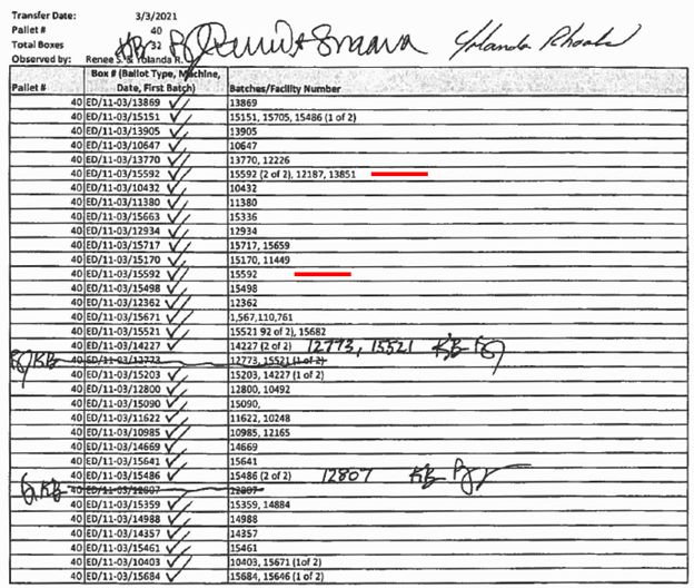 Sometimes it is just impossible to figure out what the report is trying to say, as with the two boxes of 15592, which actually had 1988 and 946 ballots for a total of 2934, instead of 1280 and 1652, for a total of 2932. Someone, at some point, moved ballots around in these two boxes. The total votes for the two boxes, combined, should be correct but the boxes don’t agree with the official results after the Ninjas have gone through them.